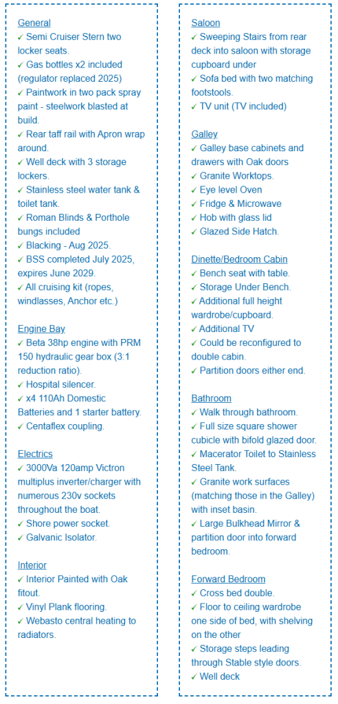 To be sold with complete inventory including roman blinds/bungs, x2 TV’s, gas bottles, crockery, cutlery, pots and pans, sofa-bed & matching footstools, ropes, fenders and full cruising kit.