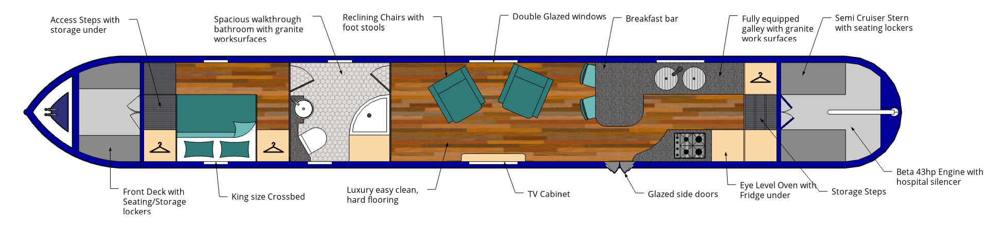 Choosing from one of our set designs, that can be viewed below, we hire out the canal boat as part of our popular narrowboat hire fleet for an increased term of 5 seasons. You’ll then get a return of the income generated from the hire fee (less Damage Waiver, Fuel and additional extras). You can also personalise your narrowboat by choosing your own flooring and soft furnishings colours, plus you’ll also get 4 weeks on board throughout the high season (including the summer holidays if you wish). Further information is provided below.