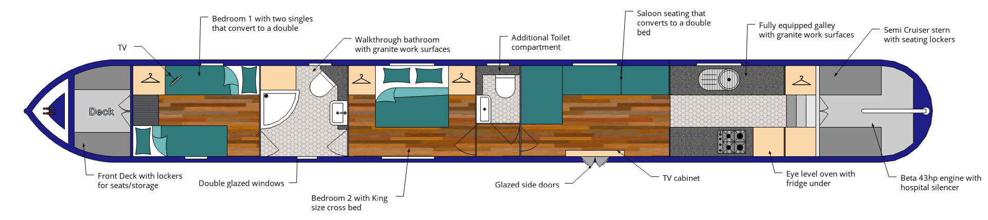 Main cabin with King Sized Crossover Bed, Second twin cabin, Saloon with NEW & IMPROVED luxury seating & walkthrough bathroom